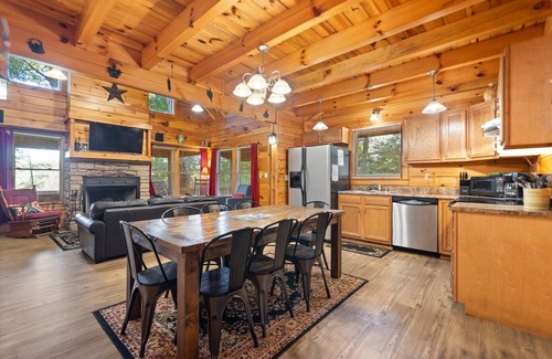 Nestled in a scenic backdrop with captivating mountain valley view! This beautiful vacation log cabin is picturesque in a fairly secluded corner of Scenic Heights Resort. (No cabins within view from the deck). Close to both Natural Bridge State Park and the Red River Gorge. This modern 3-BR, 2-BA cabin sleeps up to 8 , has a large flat screen satellite TV on main floor, an indoor/outdoor sound system, fiber optic Wi-Fi, washer/dryer, gas grill, outdoor fire pit, dishwasher, wood burning fireplace, central heat/AC,5-person hot tub & foosball table upstairs. Master BR has a king bed and a Jack-N-Jill bathroom shared with main floor and the second BR which has a king bed. Upstairs is a third BR which has a twin bunk bed with trundle and small twin built into the wall so this room can sleep up to 4 young people!. The wall twin bed is only accessible by a ladder. YOUNG CHILDREN MUST BE SUPERVISED WHEN ON LADDER. (Scenic Cabin Rentals not responsible for injuries incurred by the bunk bed) The Upstairs BR also has a flat screen TV for gaming with Blu-Ray/DVD player (The main living room TV is the only one with satellite TV) and has a private balcony. The top floor has a full bath with tub/shower to make bath time for 4 kids a splash! All will enjoy a great time grilling out on the covered wrap around deck listening to music on the sound system, or sitting in the outdoor hot tub with seating for 5 while soaking in the spectacular view. It is no wonder people leave feeling relaxed and refreshed. This beautiful log home and area makes a perfect honeymoon destination. Visit Red River Gorge, Kentucky and relax at Bobcat Lodge in the Scenic Heights neighborhood area!