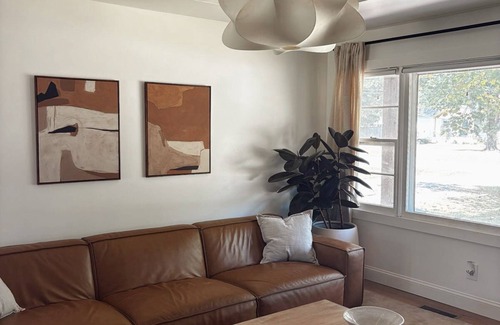 Welcome to our charming "Charcoal and Charm" retreat in Spring Hill! This charming living room features a comfy leather sofa with soft cushions, perfect for relaxing or binge-watching on the big flatscreen TV. Bright natural light fills the space, complemented by a touch of greenery and simple, stylish decor. It’s the perfect spot to unwind and feel right at home.