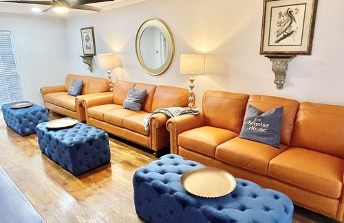 This chic home has oversized rooms, spacious bathrooms (one with a claw foot tub), allowing comfort and privacy for each couple or family. Well appointed for a bride or wedding party, but still masculine enough for the boys in our two bedrooms upstairs (golf and derby themed) or for the gentlemen wanting to escape the ladies for a bit. The Scholar House is proud to feature a handicapped accessible suite along with handicapped parking as well. If you are needing to sleep a family with all generations' from baby to grandmother, this is the home for you.