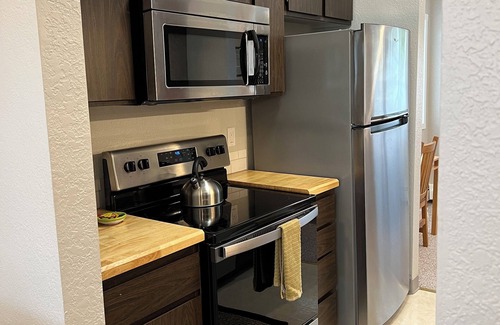 Adventure and Unwind in this comfortable 2 Bedroom/1 Bath unit, with a reclining leather sofa and love seats. Enjoy two queen beds and one twin bed. There's ample off-street covered parking under the carport, steps from the front door. The washer and dryer are in the unit, and the stocked kitchen has condiments, spices, and everything to create a delicious meal.