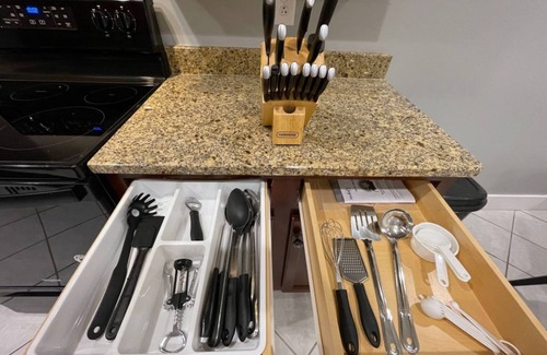 The apartment boasts a living space that includes a sofa sleeper, the kitchen has a full oven/stove/microwave and full refrigerator and the kitchen is stocked with pots, pans, silverware, cookware, dishes, mugs, glasses and more. The appliances include a Keurig coffee maker (and coffee pods), blender, toaster, french coffee press and rice cooker.