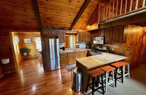 True log home built beautifully into the notch of the valley. Our home features cathedral ceilings and an open floor plan throughout the main level with multiple areas inside and outside to gather. The front porch covers the length of the house and has both covered and uncovered spaces that set the scene for a tranquil view overlooking the pond and valley below. The porch also has a 55" TV that can been seen from the outdoor dining area and outdoor seating area.