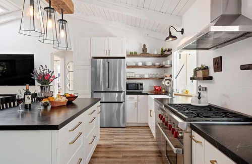 This single level home has an open floor plan with high beam ceilings that gives the indoor outdoor feel. Create an incredible meal in this fully stocked chef’s kitchen offering gorgeous countertops, prism lighting, brand new Bosch appliances, wood floors throughout, and a 6 burner Wolf stove. This kitchen opens to the cozy living room with a huge 70 inch flat screen TV which includes Direct TV, Netflix, Hulu, and HBO. Sonos sound system throughout the home. French doors lead to a patio with a gas burning firepit and patio seating, perfect for entertaining!