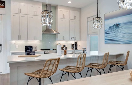 Downtime Seacrest comfortably sleeps up to 18 guests, featuring two king suites with private baths, oversized bunk rooms built for kids or extra guests, and a bonus living area perfect for movie nights or game-day gatherings. Stylish details like hardwood floors, shiplap accents, and quartz countertops bring modern comfort to every space.