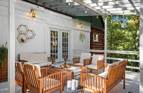 Our cabin is located one block outside of city limits on a dirt road, nestled in a beautiful forest. Newly renovated cabin, featuring 3 private bedrooms with king sized beds and two bathrooms. One bathroom has a beautiful soaker tub and the luxury shower has two shower heads. This cabin is designed for extreme comfort with luxury linens, towels and a fully stocked chefs kitchen. In addition, the cabin offers a large game room fully stocked with all of your favorite board games and a full sized shuffle board. Outside the french doors is a large covered patio, comfortable furniture, and a propane grill. Just off of the patio is a wonderful fire pit surrounded by the lush forest.