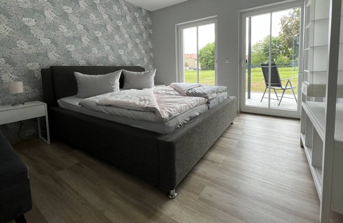 The apartment "Bertchen" is on the ground floor and is about 50 square meters. It has a living room with an open kitchen, a bedroom, a bathroom, a hall and a south-facing terrace, from which you have a wonderful view of 3,000 m² of garden land. The entire apartment has underfloor heating. The floor-to-ceiling windows have electric shutters. The apartment has a carport (W2), under which there is also the key safe for self-check-in.