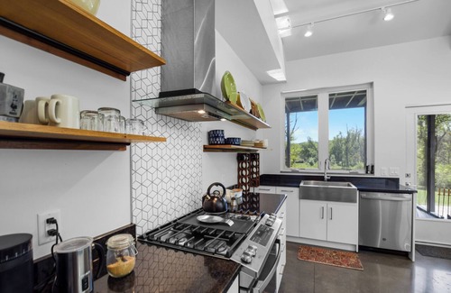 KITCHEN: Fully equipped, stainless steel stove/oven range & refrigerator, large open layout, breakfast bar seats 4, coffee maker, espresso maker (Bialetti), toaster, blender, mixer, microwave, cooking essentials, cooking utensils, dishware, flatware, glassware, bar glasses, cocktail mixer