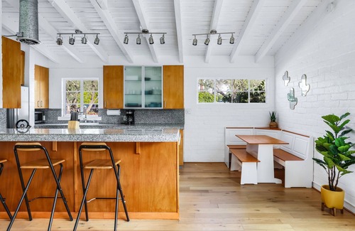 An original 50’s home, the mountain-view property has been beautifully updated inside and out - with no expenses spared. The home is surrounded by palm, olive, and fruit trees, as well as various flowers that attract hummingbirds and other colorful types. Past the courtyard and its water fountain, the walled yard features privacy bushes, as well as an electric grill, and room to dine alfresco.