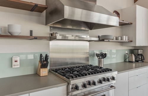 Unit A is the top floor of the duplex. It is the owners' residence for part of the year. It features curved vaulted beams in the main living area and a wall of east-facing glass. There is a large wraparound deck accessible from the living/dining area as well as the primary bedroom. The decks overlook the ocean and a large patio area. The kitchen features a large island with seating for six, Viking professional stainless steel appliances, two dishwashers, two ovens, and a scullery. The private elevator takes you from the ground floor up to the top floor. The deck off of the living room is 12 feet wide and 40 feet long.