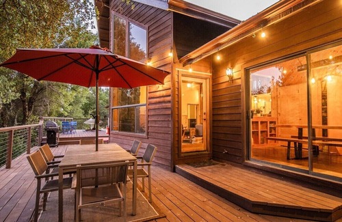 Escape it all with this 14 acre private lake cabin home, located just outside Yosemite. Swim, boat or fish off the dock, go for a nature walk on the property, let the kids play on the swings, gaze at the stars, play disc golf or just relax in the hammock and enjoy the view.