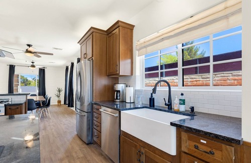 Welcome to our lovely home in the historic El Conquistador neighborhood of Tucson, Arizona. Located just over a mile from U of A, this oasis features a four bedroom, classic 1959 burnt adobe home that has been tastefully updated. Key features include an outdoor pool and patio area, recently renovated gourmet kitchen, and modern bathrooms. No detail was spared in cultivating one of Tucson's best-located vacation home retreats.