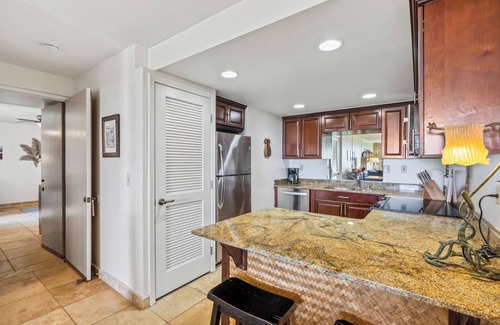 This second-floor condo showcases distinctive island-themed decor, air conditioning, a fully equipped kitchen, an in-unit washer/dryer, and a charming lanai that provides expansive ocean and mountain views along with stunning Kauai sunsets. The unit includes a cozy king bed and a full bathroom.