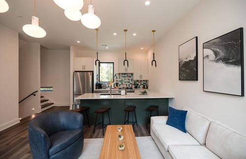 Welcome to The Canopy at Caswell! ONE of THREE high end brand new townhomes in central Wilmington. The Caswell homes can be rented individually, two, or three at a time so that you and your guests have ALL the space you could need! Each townhome features a turf rooftop with cornhole and lounge seating, brand new high end Kitchen Aid appliances, an additional bottom level flex space, two car garage, gas grill, and MORE! This upscale retreat in the center of Wilmington was designed by renowned architect Rob Romero. Each concrete, three-story townhome blends elegant architecture with high-end comfort—perfect for a romantic getaway, stylish staycation, or executive trip.