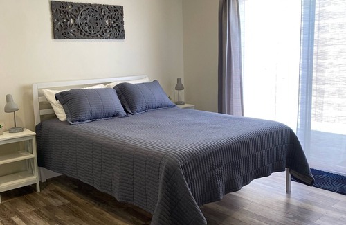 The space has a queen bed with a Casper mattress and a pull-out ottoman that can be converted to a 3rd bed or kept as a chair. There is a 65" TV, table/desk combo, a full bathroom, a full kitchen with a stove-top and a full-sized refrigerator/freezer along with a microwave/convection oven combo. Kitchen includes, blender, toaster, coffee maker, silverware, plates, cups, bowls, pans, baking sheets, crock pot, rice maker and much more.