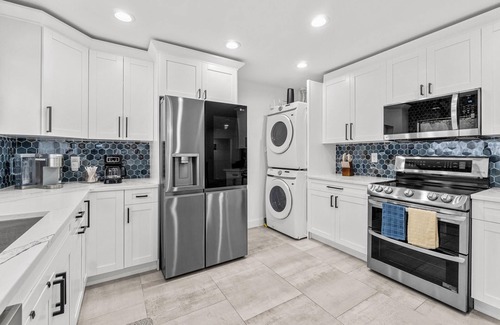The open-concept layout is filled with natural light, creating a warm and inviting atmosphere. The chef's kitchen boasts state-of-the-art stainless steel appliances, sleek quartz countertops, and Shaker cabinets, making it perfect for preparing delicious meals. This vacation rental is equipped with all the amenities, such as a coffee station, high-speed internet, a washer/dryer, central air, a furnished patio, and a gazebo for outdoor relaxation (gazebo is weather-permitting).