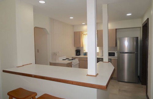 One bedroom offers a spacious king bed with two closets, while the second bedroom features a cozy queen bed and one closet. A hallway storage closet is also available for your convenience. The open living room includes a comfortable sectional sofa and a TV for unwinding during your stay.