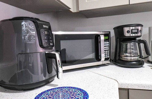 Inside, you’ll find a king-size bed that’ll make you forget any plans to wake up early. There’s also a queen pull-out sofa for extra guests (or just a change of scenery). The kitchenette is stocked with a mini-fridge, microwave, stove, and coffee maker—so you’re all set whether you’re making a meal or just pretending to. And if you’re here a while, a private laundry room is ready for any outfit refreshes.