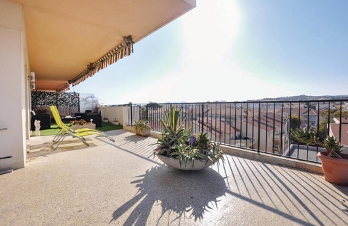 The perfect vacation home for a successful stay on the Côte d'Azur. This penthouse apartment on the ninth and last floor welcomes you in a recently built house just a few minutes walk from the center of Cannes, not far from the beaches, the train station and many other amenities. On the spacious terrace, which extends over three sides, you will find both sunny and shady spots. Depending on the side of the terrace, you may look out to the sea in the distance, the mountains in the hinterland, or La Californie, a neighborhood that stretches across a rolling hill. Enjoy your dinner on the terrace at sunset, and when a big fireworks show lights up the beach, you'll also have a great view from here. You will have a private parking space in a secured garage at your disposal. Experience the charm of the French Riviera and explore cities like Cannes, Menton, Nice and Monaco. The apartment itself is cozy and modern and has everything you need for a comfortable stay, such as air conditioning and Internet access. The double-glazed windows of the apartment provide sufficient protection from the usual noise of a city at any time of the year.