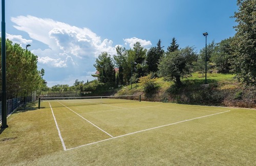 Whole 14,000 m² of beautiful nature, village idyll and comfort offers you this dreamlike property. At your disposal are two separate cottages with a common courtyard. In one house are the bedrooms, while the other house houses the living and recreation rooms. In addition to the swimming pool and a tennis court, which fit perfectly into the natural surroundings, the pool table, bicycles and board games will ensure hours of fun together. The pool can be transformed into an indoor pool with the help of a sliding roof. Traditional and delicious meals can be prepared on an outdoor fireplace. This quietly located property is the right place to relax and enjoy privacy. In the morning hours a janitor will come by to help you if you wish. Excursions to Lake Peruca, Krka National Park or the city of Sibenik are recommended.