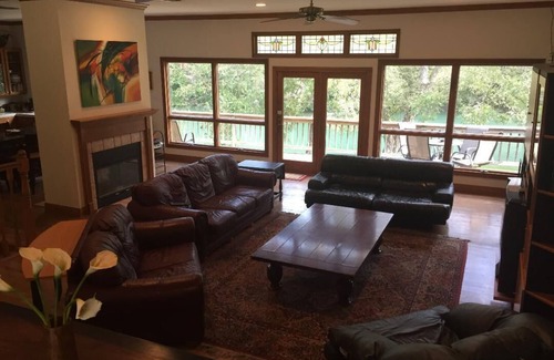 The Gruene River House Main Level is adjacent to our Front Door, Driveway, and Parking Area that can accommodate up to 10 vehicles, and includes 3 Bedrooms, our Rec-Room, and the Huge Great Room (Living Room, Dining Room, and Large Fully- Furnished Gourmet Kitchen combination area). The Great Room has vast expanses of Guadalupe River Views, and is open to the Gourmet Kitchen and Living Room containing the Double-Sided Fireplace that opens into the Gourmet Kitchen and Living Room. There is an 10-person Dining Table, a 6-person Bar-Height Dining Table, and a 2-Person Bar Dining Area. The Living Room has seating for 9 +10, when using the Dining Seating. The Kitchen has seating for 8. Additionally, the Rec-Room has Dining Seating for 4 and total seating for 13.