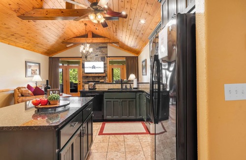 This spacious, 1,386 Square Foot cabin features Two bedrooms, Two baths (walk-in showers), 2 pillow-top kings, plus a queen sofa sleeper in the living area, and private sleeps a total of 6. The kitchen is fully equipped with all appliances, in-door ice and water dispenser, stoneware, flatware, crockpot, baking pans, etc. The utility area features a full-size washer and dryer. We have also provided a BBQ grill for your use. One small dog 40 lbs or less may be considered, PRIOR APPROVAL IS REQUIRED. Restrictions and additional fees do apply. We add excitement to your vacation with $400 in attraction tickets included.