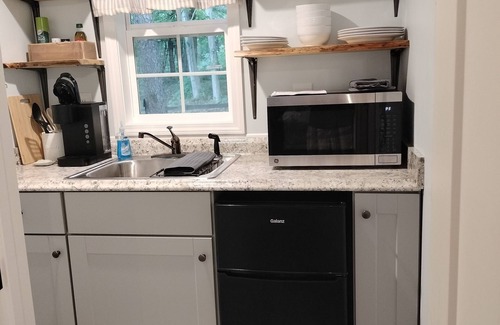 The kitchenette is stocked with everything you need, including cookware for the hotplate and microwave, air fryer, toaster, and crockpot, as well as dinnerware, glasses, and coffee mugs for four. Wake up to your morning brew with the provided Keurig coffee maker, along with starter coffee pods, tea bags, creamer, and sugar. An under-counter refrigerator with a small freezer adds convenience for longer stays, though you may need to replenish supplies during your visit.