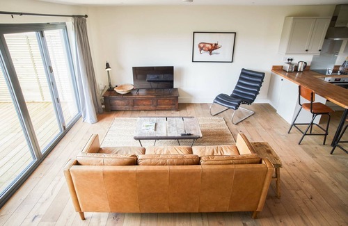 The open-plan living area is a haven for couples. Relax on the spacious sofa, unwind with the television, and stay connected with Wi-Fi after a day exploring Norfolk.