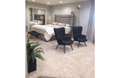 This beautiful 650sf suite is part of our 5 bedroom family home that is now entirely devoted to travelers, usually medical staff. 3 of the bedrooms (including this one) are private lux studios with no access to the rest of the house (and visa versa) with kitchen, W/D, private entry, private parking spot, and everything needed for a long or short-term stay. This studio, formerly the master bedroom with ensuite, has luxe decor in shades of grey and white; living area has a lovely peacock blue sofa, mid century easy chair, 42" TV, and sunny bay window. The plush king bed has a gorgeous tufted headboard with nearby dresser, and desk. Quartz kitchen has a state-of-the-art induction stove, large deep sink, dishwasher, convection oven, microwave, Keurig with Latte maker, all bake and cookware, blender, crockpot, InstantPot, air popper, etc everything you'll need for an extended stay. The bathroom has a large, luxurious Jacuzzi tub, separate shower, water closet, quartz counters with double sinks, an entire wall of cabinets (10) for storage, mid-century tile floors and pretty wallpaper. Large laundry room has a full size washer and dryer, and your own gated courtyard with bistro table makes this sweet little suite a wonderful home away from home!