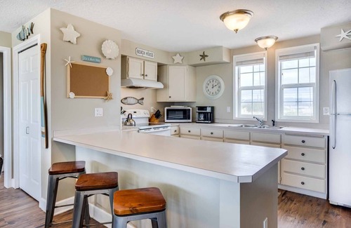 The brightly lit living area is open to the kitchen and dining room and is great for friends and family to enjoy time together and to watch the Pacific Ocean and the ever-changing sand dunes. A Shore Thing's wall of west facing windows will fill the space with light, and with its nautical and beachy decor, is guaranteed to add cheer to even the stormiest coast days. A cozy electric fireplace adds to the enjoyment of the room. Stream your favorite movie or show on the large flat screen TV in the living room after a busy day exploring the beach. Prepare your favorite feast and sit at the dining table which is perfect for family time meals, visiting, and playing board games or puzzles. A Shore Thing has a Primary bedroom with a king bed and fabulous ocean views that you can curl up in bed and enjoy! The second bedroom has a queen bed and a built in twin bunk bed. The living room also has a sleeper sofa for an additional sleeping option. One full bath is located between the two bedrooms with the second bath located off of the great room. The ocean facing deck is the perfect spot to enjoy on a sunny day where you can grill up an amazing catch of the day or sip on a favorite drink while you watch the sun sink into the Pacific.