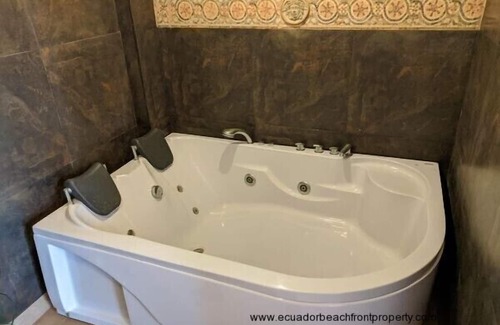 Upgraded furnished 2 bdrm, 2 bath condo furnished, sleeps 4 with a full view of the Pacific Ocean and pool. Tile flooring, gorgeous wood doors have all been upgraded. Large tiled balcony with hookup for your hammock, & ocean/beach view, dining room, living room, den/office, kitchen, laundry room. This unit is styled in colorful decor of South America. The whole unit is light and bright and the weather allows you to keep the windows open for the sweet fresh ocean air year round. Master bath has a 2 person Jacuzzi and a shower. 2nd bath has a beautiful tiled shower. This condo is gated and has a swimming pool, and parking. Right on the Pacific Ocean coast beach and Malecon in a quaint fishing village. Bus & moto-taxi transportation pick up & drop off right in front of the condo. 20 steps to beach for beach walking, shell/rock collecting, swimming, body surfing, board surfing, para surfing/sailing and Tiendas (small stores). Restaurants, large markets/shopping malls, paragliding, horse back riding, bird watching all nearby . Year round 85 degrees, high 70's at night. Bird watching, whale and dolphin watching from the balcony while having your morning coffee or a cooling cocktail watching the nightly gorgeous sunsets! MontiCristi Golf Course is about 25 miles. And, you can visit the beautiful town of MontiCristi where the Panama Hat originated! Newly built Malls in both Portoviejo and Manta as well as close medical facilities. This quaint fishing village has plenty to offer, especially fresh caught fish everyday and fresh picked veggies and fruits at the open air markets. Just bring your bathing suit, sunscreen, sunglasses and toothbrush.