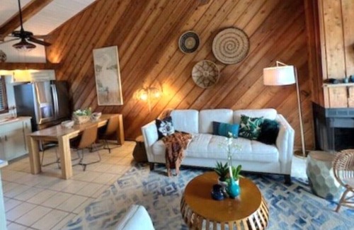 The living room has vaulted ceilings and is beautifully decorated with 2 comfy couches and the ocean in the background to view through the sliding glass doors. The fully loaded open kitchen has a counter seating and is great for entertaining.