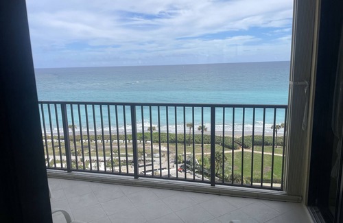 Sought-after Jupiter oceanfront condo, end unit on the10th floor, provides forever views of the Atlantic Ocean (no streets to cross) and beautiful night time city views. Amenities include 2 heated pools: one lap pool, and one facing the Atlantic, 9 tennis courts, with tennis pro, outdoor parking & 24 hour private guard gate house at entrance. Gracious living & dining room areas, ocean front private balcony is perfect for outdoor enjoyment, Master with en-suite bathroom, new Westin King-size "Heavenly Bed," large walk-in closet, tv, balcony with ocean and city views. Den is open layout to living room area, with sleeper sofa bed and air mattress, if needed. Bedroom also has a Samsung HD TV. Den has a full private bathroom. The living square footage of this end unit is larger than the the two bedroom condos in the complex. BOTH,FULL BATHROOMS, REMODELED