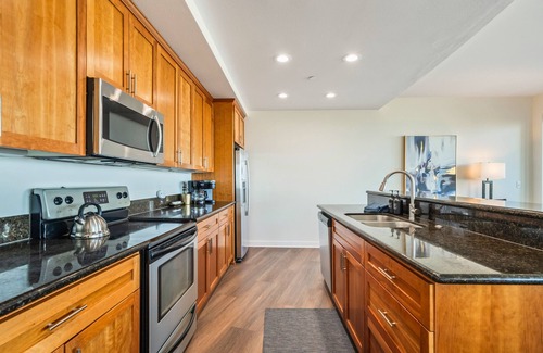 Step inside to an inviting open-concept living space bathed in natural light, where floor-to-ceiling windows showcase sweeping ocean views. The plush seating area is perfect for lounging with a book or watching a movie, and the queen sleeper sofa provides extra space for guests. The fully equipped kitchen, with its warm wood cabinetry, sleek granite countertops, and stainless steel appliances, has everything you need to prepare meals with ease. Gather around the dining table for a home-cooked dinner, or take your meal outside to the private deck, where the salty sea breeze and crashing waves create the perfect coastal dining experience.
