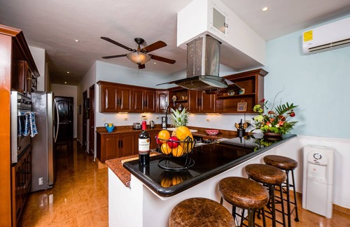 With 5 bedrooms and 4.5 baths, there’s plenty of room for everyone in this fully equipped seaside home within the gated community of Playa Paraiso. Tastefully designed by local master architect Jesus Romero, the home boasts gorgeous marble floors, ceiling fans and air conditioning throughout.