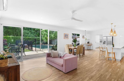 Located at the end of a quiet close just one street back from the beautiful sands of Clifton Beach, this spacious contemporary house features interiors with fresh décor and furnishings, beautiful ceramic timber floors and an ambience of relaxed tropical sophistication throughout. The convenient one-level layout comprises four good-sized bedrooms, a well-appointed entertainer’s kitchen, an in-house bar to create your own drinks and cocktails, and an expansive open plan living and dining space with a wonderful indoor/outdoor connection. There’s a lovely outdoor entertaining area with a tranquil leafy backdrop overlooking the pool, while the garden has plenty of lawn to run and a fantastic kid’s cubby house and swings. Private, fully air-conditioned and with three bathrooms and two separate toilets, this fantastic property is the ideal family beach getaway. Situated a short drive to the local shopping centre with a large supermarket, medical and all other amenities, it’s also easily accessible by car or beach walk to Palm Cove, with its huge range of restaurants and cafes.