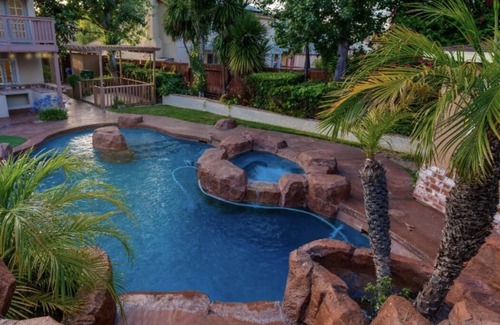An extraordinary haven, perfectly tailored for unforgettable family getaways or tranquil retreats with friends. Our home offers a secluded escape from the hustle and bustle of everyday life. Immerse yourself in the splendor of our pool, hot tub spa, water slide, and waterfall feature, palapa, Built in BBQ, Fire pit,basketball court, putting green, pickle ball, ping pong, board games, spike ball plus more.