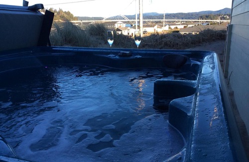 This home is a wonderful retreat for a couple, small family or two couples. A Bose music system and Wi-Fi are provided. There are 2 flat screen TVs ( master bedroom and living room) with Netflix subscription. The house has two bedrooms, one with a new king size bed, the second bedroom has a queen size bed. There is also a queen-sofa sleeper ( w memory foam topper) in the living room. The master bedroom has an ocean view, TV, and attached full bath. The second bedroom has a stunning view of the Waldport bridge from its own private deck and a 6 person hot tub. You can view the bridge lights at night and sunrises in the morning! The kitchen is stocked with everything you would expect: dishes, glasses, silverware and appliances including coffee maker, Keurig, grinder, toaster as well as spices and some staples. You will love the view from the dining table, which seats eight.