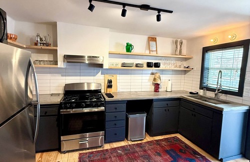 Channel your inner chef in the fully equipped kitchen, complete with all essentials: pots, pans, utensils, dishes, a coffee maker, a stovetop oven, and a full-size refrigerator. Whether you're preparing a simple breakfast or a family-style dinner, this space has you covered. Enjoy meals around the modern round dining table with seating for six, ideal for sharing both food and stories.
