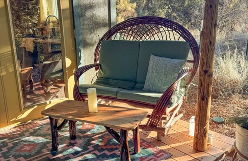 Located on a 85 acre private nature reserve called Birdsong Backcountry Retreat, this little one room hideaway is in its own fenced compound under giant oaks and surrounded by Great Basin Sage. Kick back on deck to relax, breathe fresh air , nap in the hammock and listen to the birds. You will love our fresh well water, serta queen sleeper, beautiful kitchen with all amenities, 3 1/2 miles of trails, star lit nights and local wineries. Wifi and shared bathhouse just steps away. GUESTS MUST PROVIDE THEIR OWN BEDDING AND TOWELS