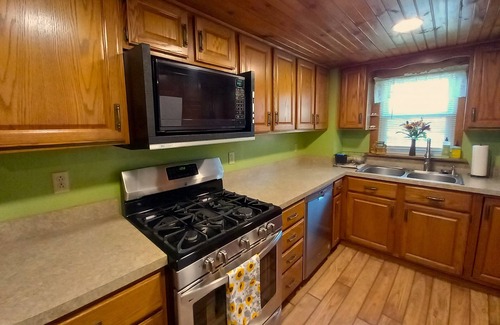 The kitchen is fully stocked with plates, bowls, glasses, and utensils for dining; as well as a variety of pots, pans, cooking utensils and bakeware. Dine at the hand-crafted pub table (seats up to 6) made from a repurposed Jack Daniels whiskey barrel. When you're done, a dishwasher simplifies clean up! Only 6 miles from Super Walmart and Aldi so you can stock up on everything you need to enjoy excellent homemade meals.