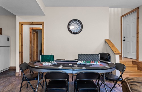 Downstairs you will find the family room with lots of seating, large TV, extra large game table for 8, wet bar that includes a coffee station and full sized refrigerator. Downstairs bedrooms: Master bedroom has a Queen bed and a Full bed, ceiling fan and TV. There is also a twin day bed (no trundle). Master bathroom has double sinks and a tub/shower. Bedroom 4 has 2 Queen beds, TV and ceiling fan. Guest bathroom on this level as well with a shower. This home will sleep a maximum of 10 people.