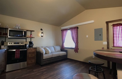 Our Rail Station is a cozy 512 sq. ft. cabin, featuring one bedroom, one bathroom, and a sofa sleeper for the kids, perfect for small groups. Need another cabin to accommodate your gang? Click on our profile to check out the other great listings in our Old West Town!