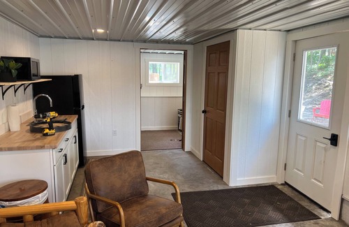 This Prairie Lake Cabin features low elevation with no stairs to the water. Recent historically-sensitive renovation. Features wide-plank floors, stone fireplace, exposed ceilings, 1 Bedroom with queen size bunks and 1 Bedroom with a queen size bed and 2 sofas with sleepers upstairs. In the walkout basement there is a family room and a bedroom with Twin XL over a Queen bunk bed setup. Please note that the walkout basement has no internal staircase to upstairs, you must go outside to go to main floor of the Cabin. On this large, wooded lot you will enjoy the firepit, flat walk out to sand shore, excellent fishing, views of undeveloped land across lake and water on both sides of you on this quiet peninsula. A new aluminum dock for your boat plus a sitting area right on the dock to enjoy the views. Furnished with quality decor, one-of-a-kind items and even premium linens and towels for 8 guests. Just bring your fishing poles and come and relax!