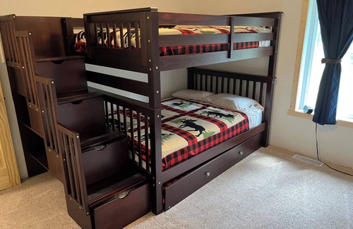 We currently have two king size beds and two triple bunk beds with full size mattresses! It's 4 bedroom and 2 baths! You will have access to the whole cabin as well as plenty of parking for vehicles and trailers with your boats, ATV s and snowmobiles! There is also an outdoor campfire area! Bring your weinies and S'mores!