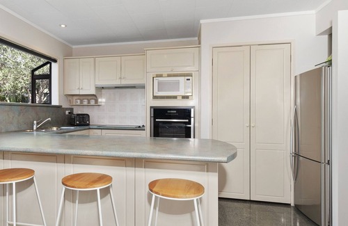 Step into a comfortable open plan living set-up at this multi-level holiday home. Enjoy seamless indoor/outdoor flow with bifold doors that open onto an entertaining outdoor area on one side; and ranchslider to the rear garden on the other. Sitting under the pergola is the perfect spot for breakfast or morning coffee. Or fire up the BBQ for classic kiwi meals on the patio!