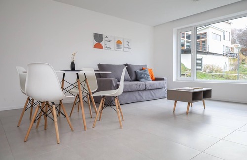 This charming one-bedroom apartment is located in the heart of the city, on Main Street, with city views visible from both the living room and the bedroom. The fully equipped kitchen makes meal preparation easy, while the living room offers a comfortable double sofa bed for additional guests. The master bedroom features a cozy double bed, and the modern full bathroom provides everything needed for a relaxing stay. Ideal for couples, this centrally located apartment combines urban comfort with natural beauty.