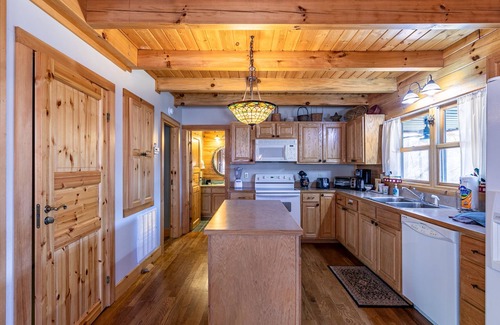 This gated community log cabin has four bedrooms and is ready to make your group feel at home. The driveway is gravel and flat and there are only four steps to enter the main level. Once inside, enjoy the gas log fireplace and leather sofa, or cross over to the kitchen and dining area. The kitchen is cozy, well-stocked, and includes a table for six. Just off the kitchen is a screened in porch that overlooks Hidden Lake. There is outdoor dining table for six and casual seating for relaxing. The queen bedroom is located on the main level and across the hall is a full bathroom with a combination tub/shower.