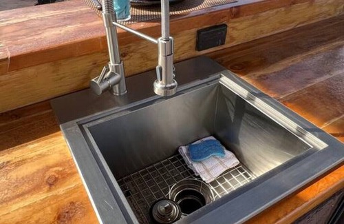 This wagon has 1 Queen bed, 2 bunk beds and an indoor bathroom with a shower, flushing toilet and a sink. This wagon has heat and air conditioning. Outside there is a kitchen with a gas BBQ grill with one side burner, a sink, a refrigerator, a dishwasher, an ice maker and a Keurig coffee maker. Dishes, cups, silverware, cooking utensils and kitchen towels are included in the kitchen.