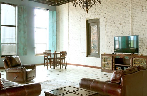 Oversized loft with large patio. Equipped with Gigaone internet, and a gym. Downtown and across the street from a restaurant with live music. Relax and watch Tv while soaking in the spacious, jetted bathtub. Beautiful oversized kitchen for entertaining and hanging out and then relax on the comfortable sofa in the living area.
