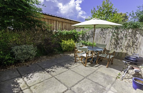 Pretty sunny south facing courtyard garden with patio set. Surrounded by colourful plants and vines making it a lovely setting for an evening BBQ, the unique decked "lovers" seating area is a lovely place to unwind.